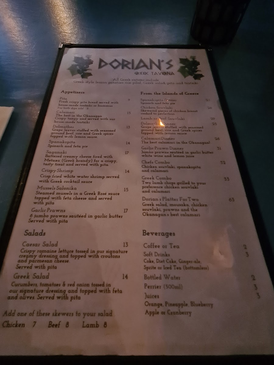 The menu at Dorians Greek Taverna Vernon offers a balanced selection of traditional Greek dishes and hearty bar fare, creating a welcoming and relaxed dining experience. Whether you’re stopping by for a casual meal or a leisurely evening with friends, the menu’s variety suits many occasions—from sharing small plates like Saganaki or Calamari to indulging in satisfying mains such as Roast Lamb or the famous Rack of Baby Back Ribs.